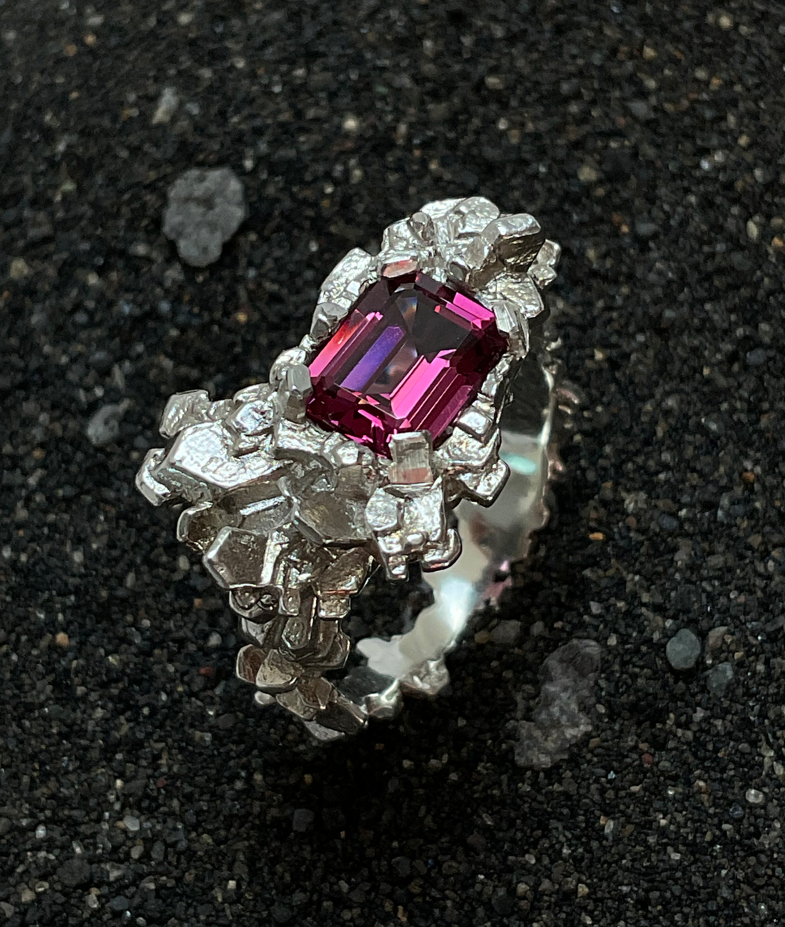Der fertige Ring wurde in Silber gegossen und trägt einen wunderschönen Granat im Zentrum. Den Stein habe ich bei der Firma Schütt in Pforzheim gekauft, die sich sehr für Nachhaltigkeit einsetzen und nur Steine aus bestehenden Ressourcen verwenden. So stehen sie für den Schutz von Mensch und Natur.