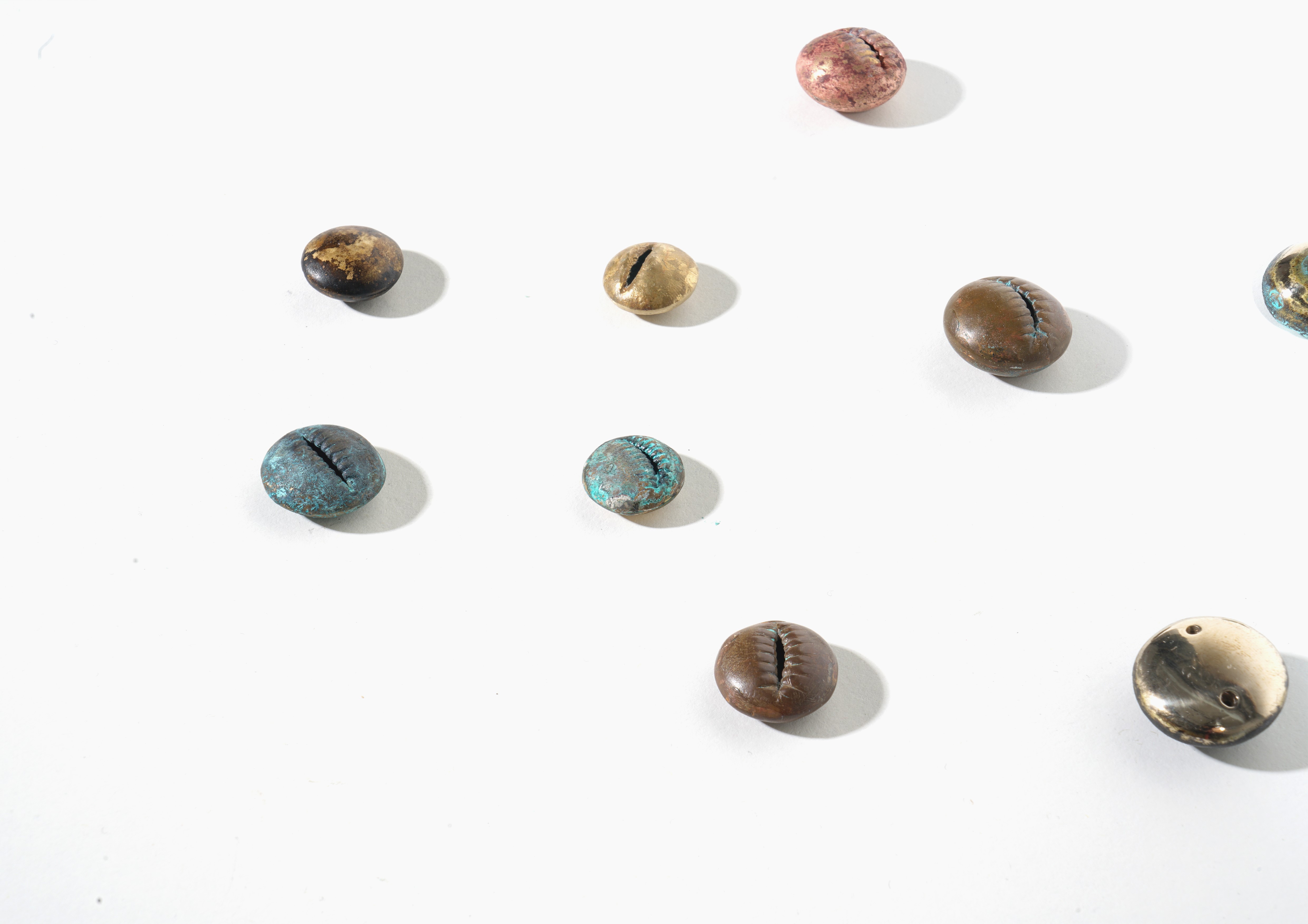 Der Vollmond brachte eine größere Flut mit sich und die Gezeiten brachten Muscheln ans Ufer, die das ursprüngliche Geld darstellten. Tausende von Jahren später sind die Münzen immer noch golden und rund, erinnern sie Sie an den Vollmond? Mit diesen Objekten, deren Formen sich zwischen Mond, Münzen und Muscheln bewegen, versuche ich, eine mögliche Verbindung zwischen ursprünglichem Schmuck, Reichtum und dem Treiben auf der Erde und im Universum herzustellen.