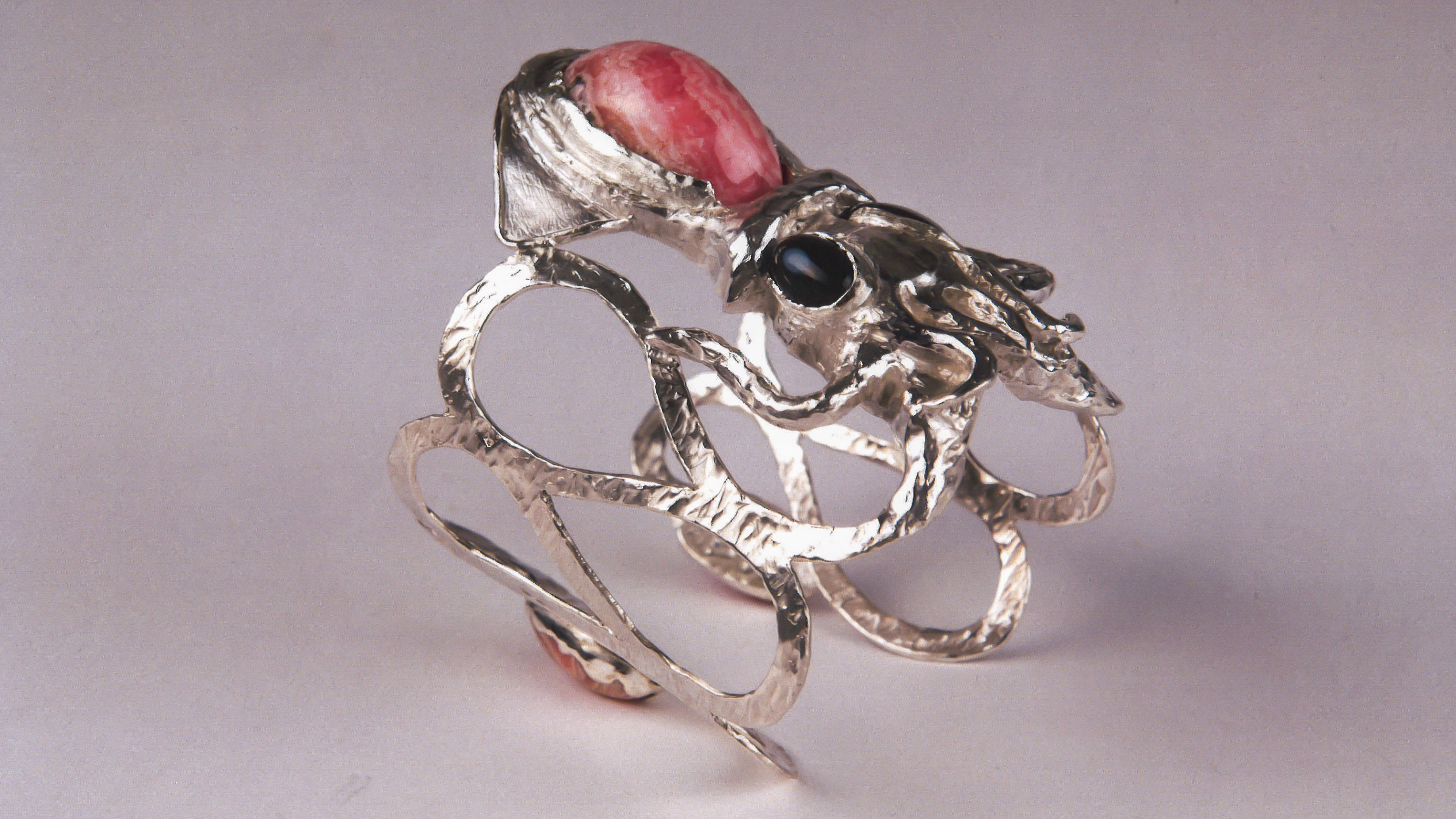 The work used materials such as silver and precious stones. The undulating and slightly polished texture of this work symbolizes the connection with the sea. The octopus also has two powerful tentacles that have the function of holding the bracelet on the hand. The wearer of the bracelet can easily fix the octopus to their arm and easily change the shape of the tentacles.