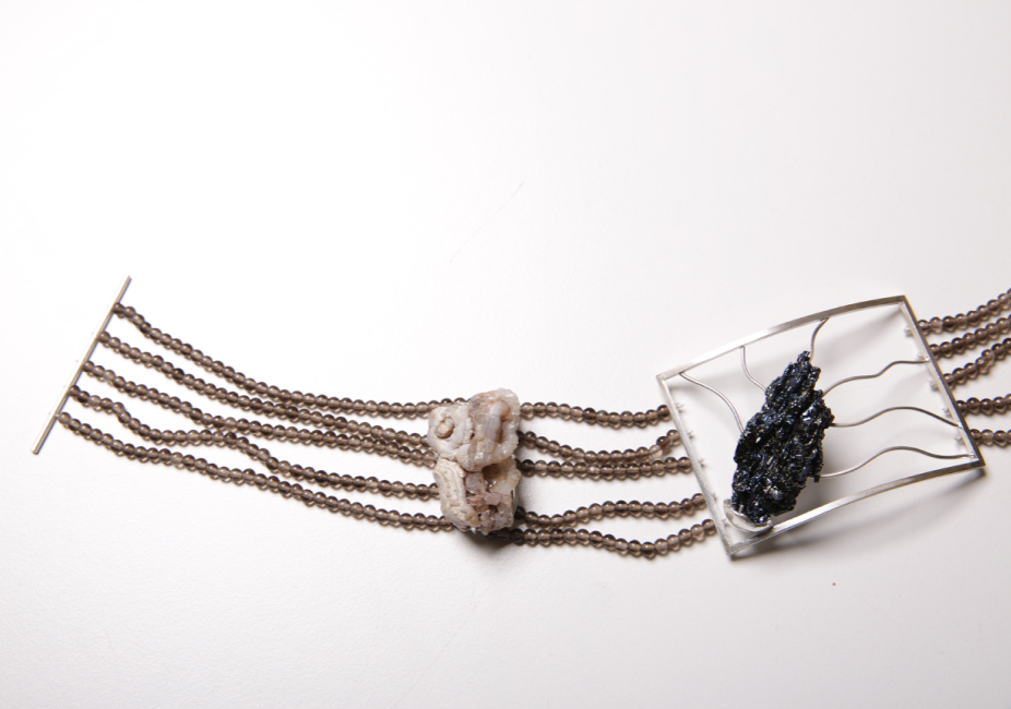 The silver (925) necklace heavily refers to the Art Nouveau style, bringing to mind celestial bodies traveling through our solar system. The main panel was designed to add the asymmetrical quality to the composition, while keeping in mind the art nouveau design traditions of meandering vines. Framed in a silver“comet”, silicon carbide is supposed to bring to mind something extraterrestrial with its texture and shape. The material was chosen because of its history: it was first discovered in a meteorite. The repeated comet motif in the hidden clasp is intended to symbolize its returns. Strings of smoky quartz mute the rich color and texture of the necklace. All settings should be as little visible as possible, without distracting attention from the story told by the necklace. Chalcedony that were placed on the sides resemble nebulae. The necklace is meant to surround the person who wears it, reminding them that they are part of something bigger. A concept that was here before them and will return after their demise.